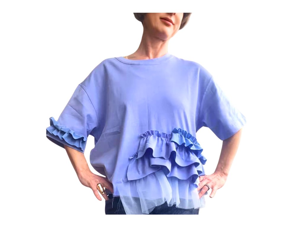Model je vytvořený z kvalitního trika formou upcyclingu. Zdobeno bavlnou, košilí a tylem.