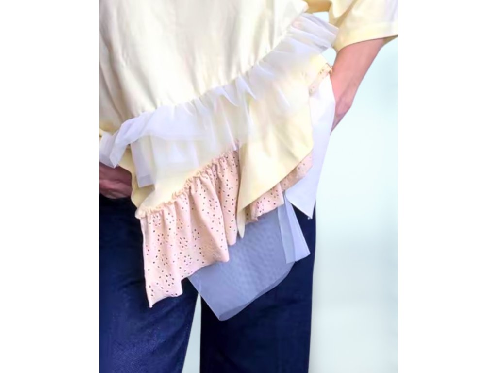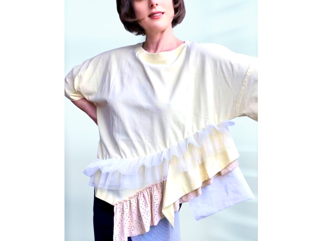 Model je vytvořený z trika formou upcyclingu. Zdobeno bavlnou a tylem.